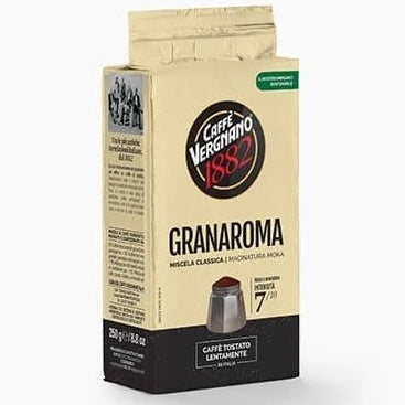 Caffè Vergnano Granaroma er en klassisk italiensk kaffeblanding som kjennetegnes av en god balanse mellom Arabica-bønnenes aromatiske eleganse og Robusta-bønnenes kraftige kropp. Denne kombinasjonen resulterer i en fyldig smaksopplevelse preget av tydelige noter av sjokolade og krydder, som avrundes med en fløyelsmyk og vedvarende crema.