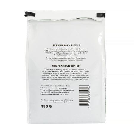 Johan & Nyströms Strawberry Fields er en lysbrent etiopisk kaffe fra Guji-regionen, tørket naturlig i bærform for å bevare sødmen. Den har friske smaksnoter av jordbær, plomme og vannmelon, med livlig syrlighet og ren fruktighet. Kaffen passer best til filterbrygging, som fremhever dens delikate aromaer. Resultatet er en leken, sommerlig kopp som minner mer om dessert enn frokost.